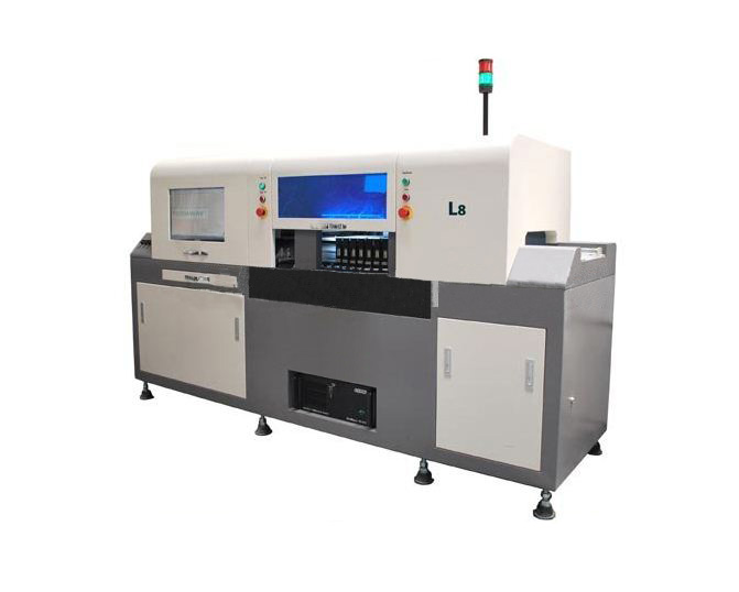 TERMWΛY泰姆瑞/德国/LED专用贴片机/在线式LED专用贴片机 L8: L8贴片机是一款在线式LED专用贴片机,可以和全自动丝印机、回流焊实现无缝接驳。用来实现大批量LED电路板的组装,具有“在线式”“高速”“高精度”等特点。 【特点】: 1.电路板传动采用精密电机带动工业皮带配合精密导轨实现,有效提高贴片精度。 2.采用天然花岗岩一体化设计制造的超高精密运动平台技术。确保贴片机长期使用十年以上,运动精度不会发生任何变化。同时,一体化的结构还具有非常优秀的抗震能力。 3.配置8组贴片头,相比1组提高生产效率500%以上。 4.可自动视觉编程,不用手动输入元件坐标,编程简单,方便入门者便捷实用,满足大批量多品种生产的需求。 5.配置不同的喂料器可以满足不同的LED贴装要求。 6.高性价比LED贴片机,最适合大批量LED生产。 7.整机由工业计算机配合专用软件控制,方便操作实用。 8.可以非常方便导入电路板CAD数据。 9.可以非常稳定并且方便的完成LED拼版的编程和贴装。 10.可以在软件中显示拼版中所有坐标点,并对其中的坐标进行微调,实现高精密的贴装。 11.可以在软件中设置各拼版的间距,并根据间距显示所有放料坐标,可以选择不贴的拼版。 12.软件可以实现八贴片头自动优化功能。 13.软件中增加XYZ轴移动时的限位检测。 14.软件中增加了多档变速功能,可以根据移动距离查表得到最佳速度,并进行速度设置,可以提高机器长期使用的稳定性。 15.整机PCB平台具备真空吸附功能,对大型PCB板定位会更加平整,有效提高贴片精度,同时可以满足软灯条(FPC)的定位贴装。 16.机器实现电路板在线式的传输,有效节约人工,提高效率。相比同类产品,可以节省至少一个操作人员。如果配合自动丝印机。可以至少节省两个操作人员。提高了整条生产线的生产效率和长期使用的成本。 【标配】: 1、计算机1套 2、贴片头8组 3、吸嘴8个 4、真空吸附平台1组 5、喂料器底盘GFTA-T081组 【选配件】: 1、8mm,12mm,16mm,24mm,32mm自动喂料器 2、吸嘴 3、工业气泵 4、UPS不间断电源 5、喂料器底盘GFTA-T08